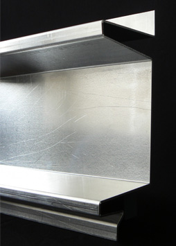 Tee Section Fin in 1.5mm aluminium to have welded stop-end one end prior to Polyester Powder Coating. Finished component used as an external cloak to cover steel section projecting through cladding.